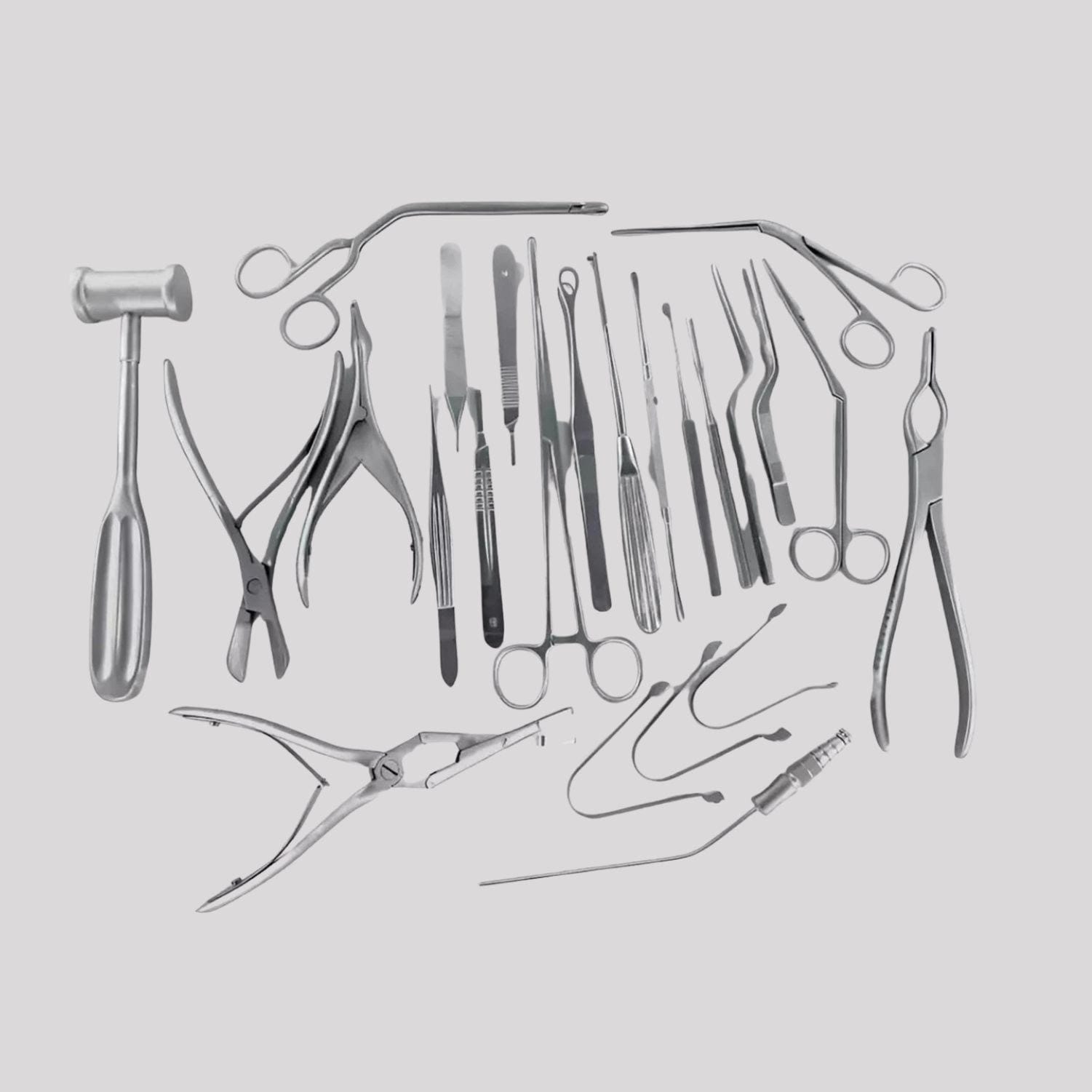 The set includes a variety of precision instruments such as scalpels, forceps, scissors, elevators, and needle holders, each designed to perform specific tasks in septoplasty surgeries. The ergonomic handles offer superior grip, while the precision tips allow for minimal tissue disruption. The instruments are autoclavable and designed for ease of sterilization, maintaining the highest standards of hygiene in surgical environments.
